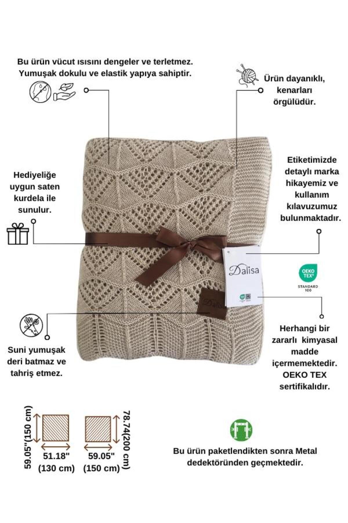 Triko Örgü Tv Battaniyesi & Koltuk Örtüsü Emily geleneksel el örgülerinin sıcaklığı ve modern tasarımın zarafetini bir araya getirerek evinizi güzelleştiriyor.; Bu ürün, modern ve zarif tasarımıyla dikkat çekerken, farklı kullanım alanlarına uygun olarak tasarlanmıştır.; Ürünümüz, sıcak ve yumuşak bir dokunuş için akrilik iplik kullanılarak üretilmiştir.; Ayrıca nefes alabilir ve hafif bir hacme sahip olmasıyla dikkat çeker, bu da kullanımını daha keyifli hale getirir.; Özel örgü dantel deseni ürünü evinizin dekorasyonunu tamamlayacak bir aksesuar olarak öne çıkarır.; Emily, rahat oturma alanları yaratmak için koltuklarınıza veya kanepelerinize örtü olarak kullanılabilir.; Hem fonksiyonel hem de estetik olan bu battaniye, yüksek kaliteli malzemeler kullanılarak üretilmiştir ve uzun ömürlüdür.; Ürünümüz OEKO-TEX STANDARD 100 Sertifikasına sahiptir.; Bu sertifika, ürünlerimizin yüksek kalite ve güvenlik standartlarına uygun olduğunu ve ürünlerimizin çeşitli zararlı maddeler açısından test edildiğini gösterir.; Güvenli ve sağlıklı bir deneyim sunmak bizim önceliğimizdir.; Evteks olarak, sadece kaliteli ürünler sunmakla kalmıyor, aynı zamanda dünya genelinde olumlu bir etki yaratmaya da odaklanıyoruz.; Geri dönüşüm, yeşil enerji kullanımı ve sosyal sorumluluk projeleriyle çevremizi koruyor ve topluma katkı sağlıyoruz.; Ürünlerimiz sadece günlük hayatınızı değil, aynı zamanda dünyamızı daha iyi bir yer haline getirmek için tasarlanıyor.; Hayatınıza güzellik katarken, çevrenizi ve toplumu desteklemek için Evteks i tercih edin.; Triko Örgü Tv Battaniyesi & Koltuk Örtüsü Emily ile evinizin konforunu ve zarafetini artırın.; Hemen sipariş verin ve şıklığın keyfini çıkarın! Ürün örgü yapısından dolayı ±5-10 cm değişkenlik gösterebilmektedir.