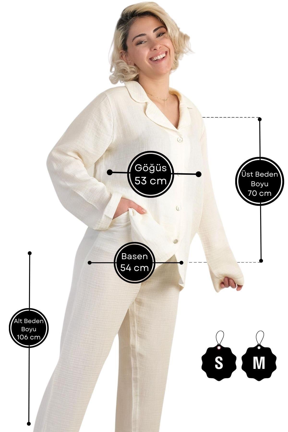 Kadın Müslin Pijama Takımı özgün tasarımıyla rahatlık ve zarafeti bir araya getiriyor.; Atölyemizde özenle tasarlanan ve dikkatle dikilen bu takım %100 yerli üretimdir ve sağlığa zararlı maddeler içermeyen yapısıyla öne çıkar.; Müslin kumaşı, cildi rahatlatır ve nefes alabilirliğiyle dikkat çeker.; Makinede kolayca yıkanabilen bu takım, dar kalıplı olduğundan bir beden büyük tercih edilmesi önerilir.; Ürünümüz OEKO-TEX STANDARD 100 Sertifikasına sahiptir.; Bu sertifika, ürünlerimizin yüksek kalite ve güvenlik standartlarına uygun olduğunu ve ürünlerimizin çeşitli zararlı maddeler açısından test edildiğini gösterir.; Güvenli ve sağlıklı bir deneyim sunmak bizim önceliğimizdir.; Kendinizi özel hissetmek ve geceye zarafet katmak için hemen şimdi sipariş verin, rahatlığın ve şıklığın keyfini çıkarın!